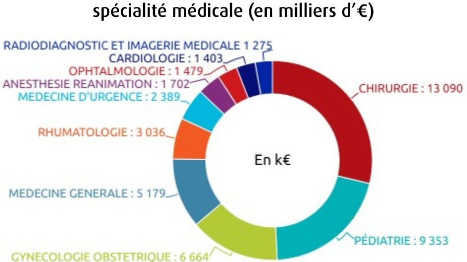 En chirurgie, l’orthopédie (3,4 M€) et la chirurgie viscérale (3,3 M€) arrivent en tête.