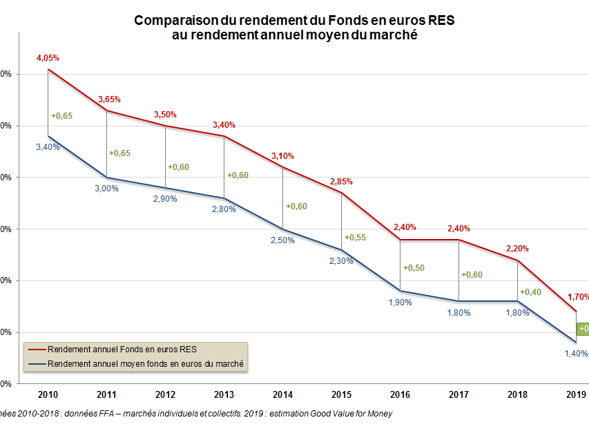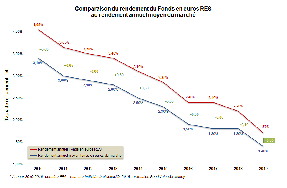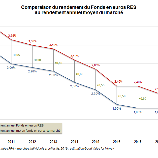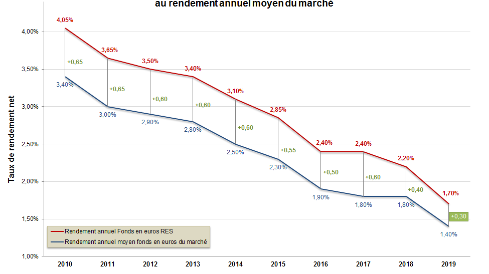 Le rendement du fonds en euros RES de la MACSF a depuis dix ans été nettement plus élevé que le rendement moyen des fonds en euros du marché français. Le RES reste plus performant que la moyenne grâce à la diversification de ses actifs.
