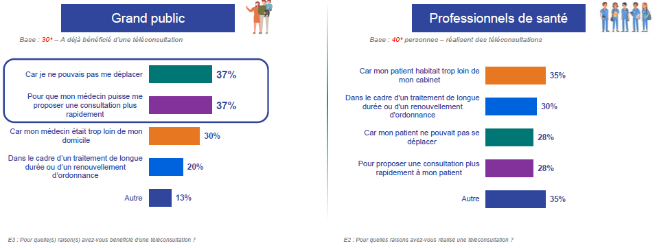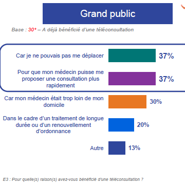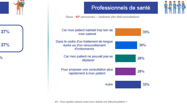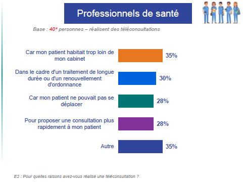 Du côté des médecins, les raisons sont faiblement hiérarchisées. Néanmoins, 35% des médecins évoquent l'éloignement du patient comme motif de la téléconsultation et 30% justifient la téléconsultation par ce qu'il s'agissait d'un traitement de longue durée ou d'un renouvellement d'ordonnance.