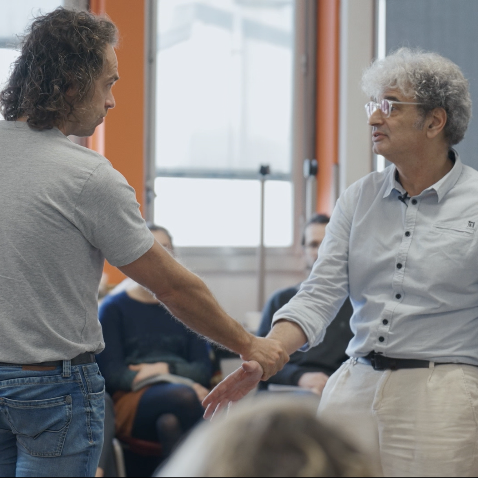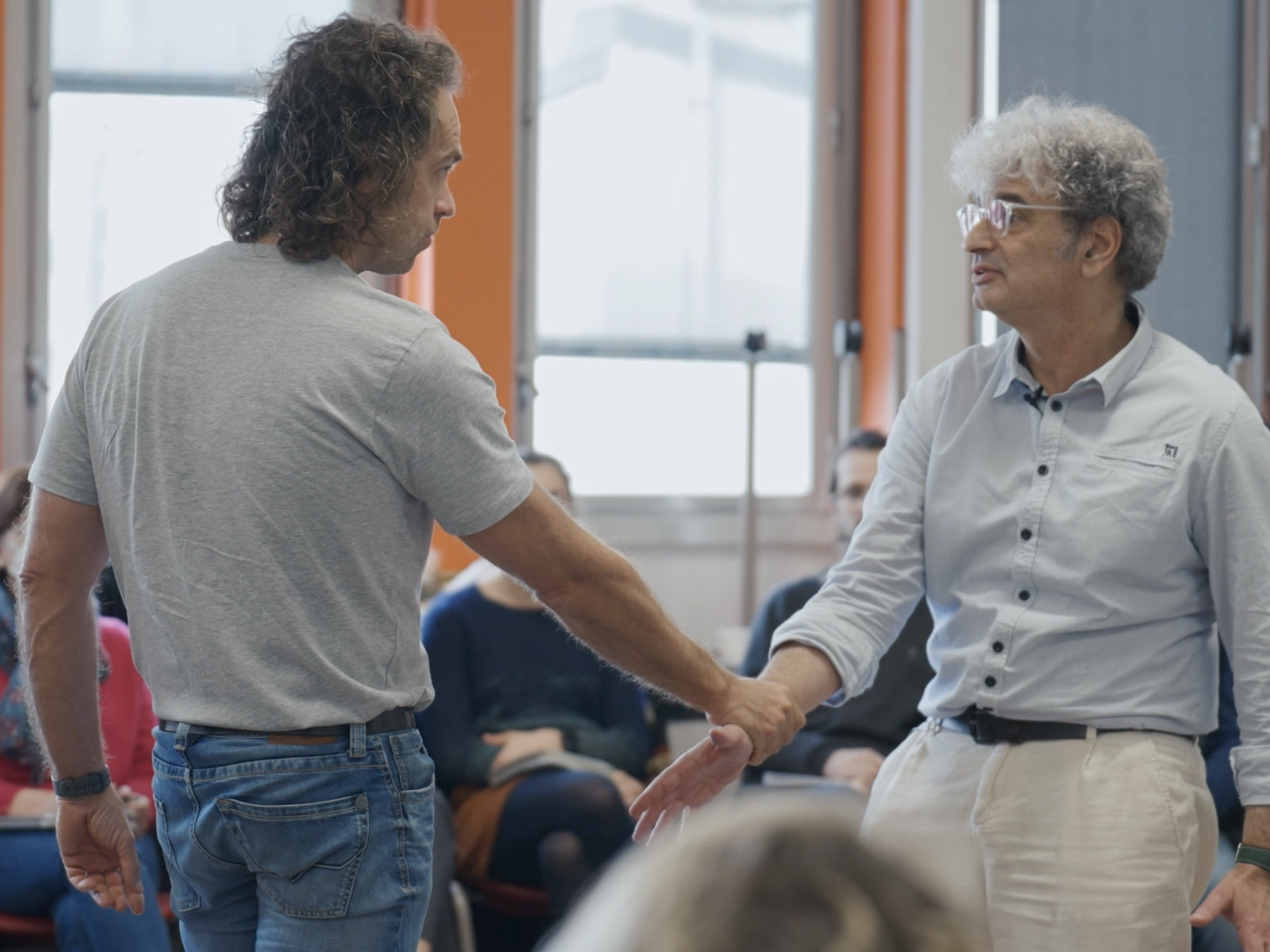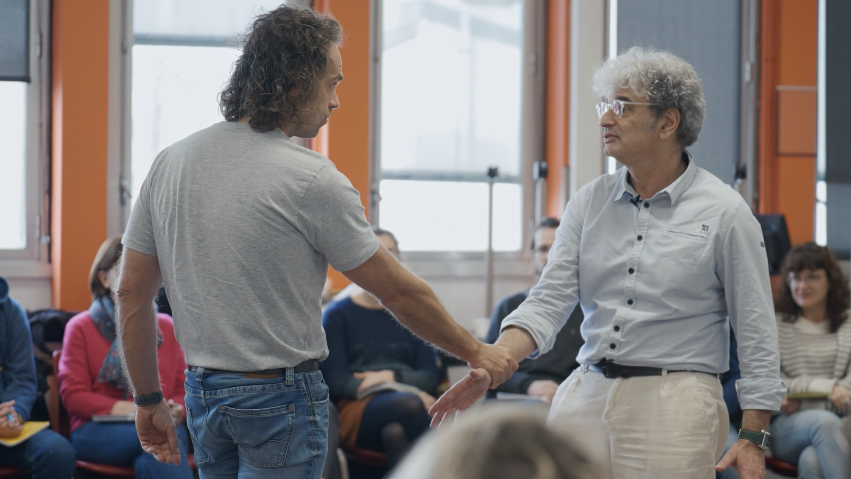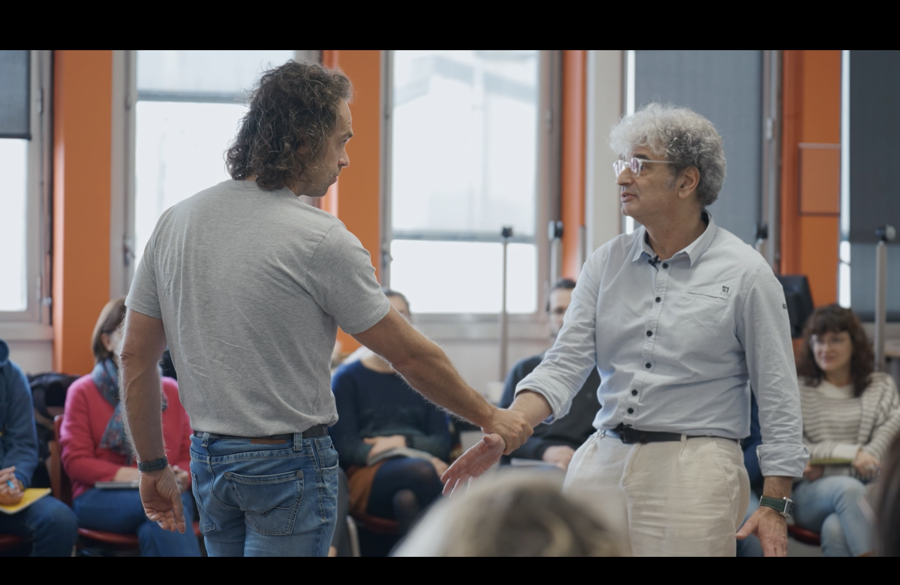 La réalisatrice filme des soignants pendant près d'une année qui ont choisi de suivre un diplôme universitaire à Sorbonne Université pour apprendre à mieux gérer leur stress et à améliorer les relations de soin avec leurs patients. L'image est extraite de l'un des cours où l'enseignant mettait en scène une situation conflictuelle avec un patient.