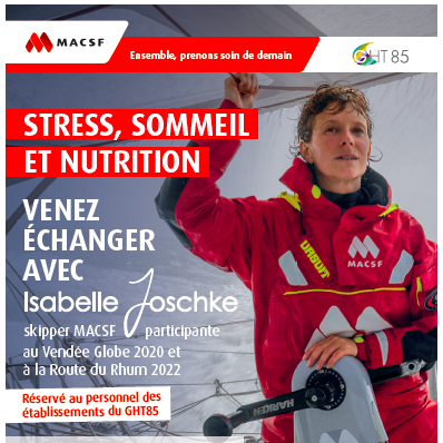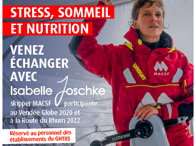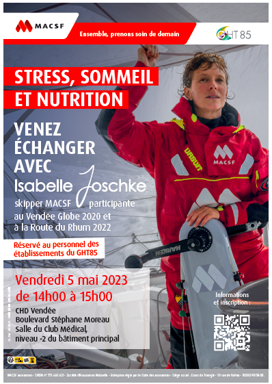 Isabelle Joschke sera présente au CHD Vendée à La Roche sur Yon le vendredi 5 mai pour échanger sur le sommeil, la nutrition et la gestion du stress, des thématiques communes à la skippers et aux professionnels de santé.
