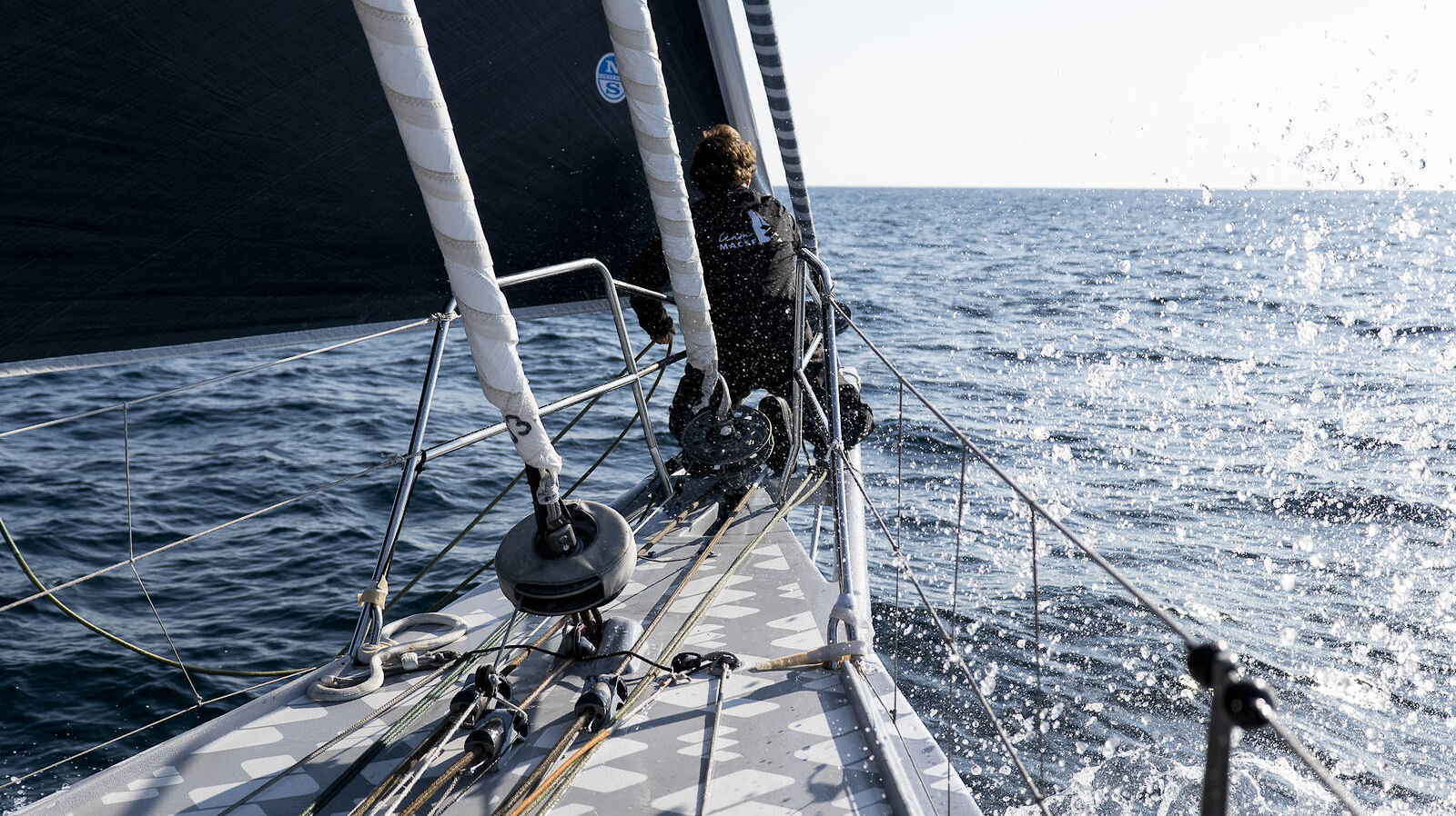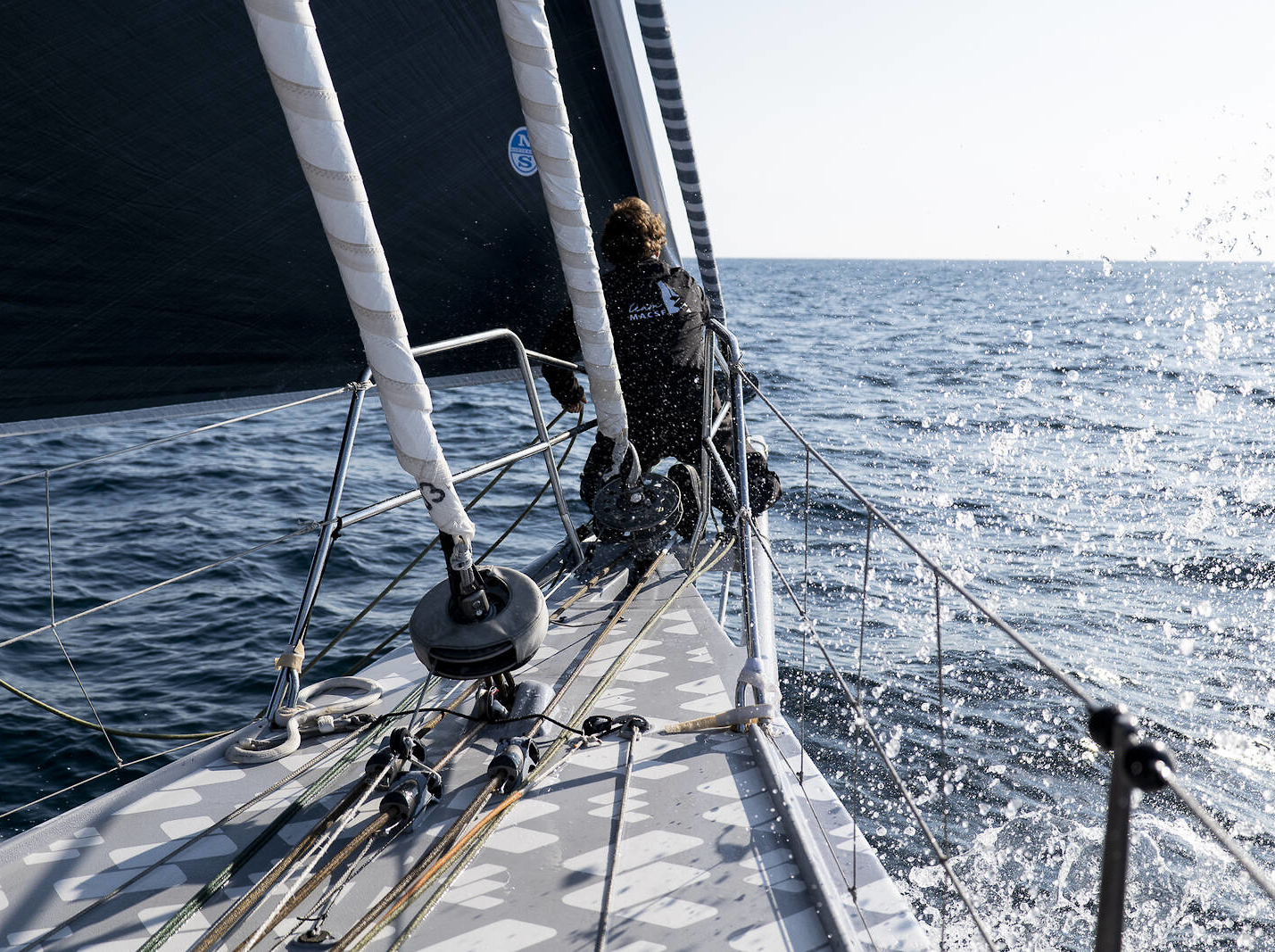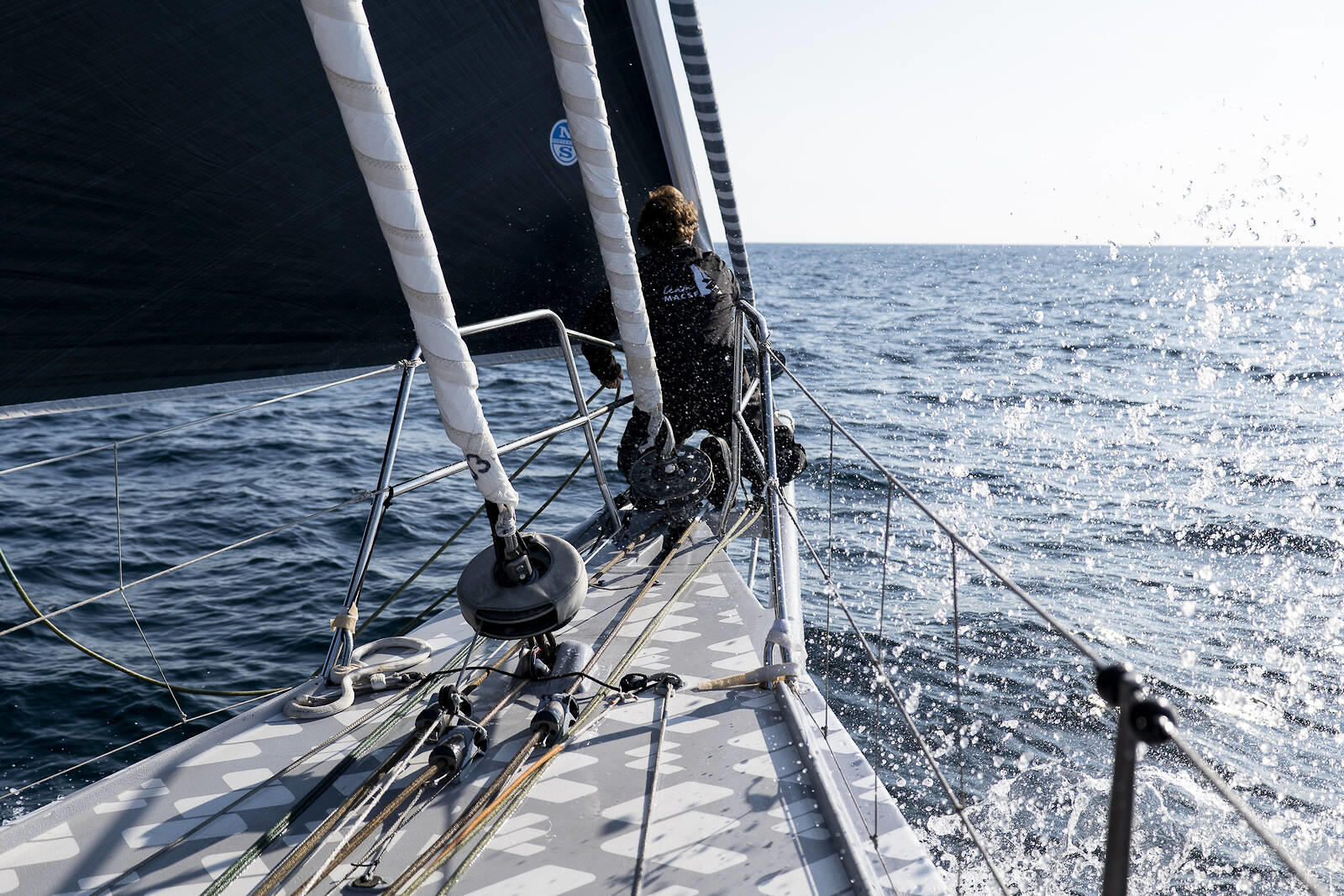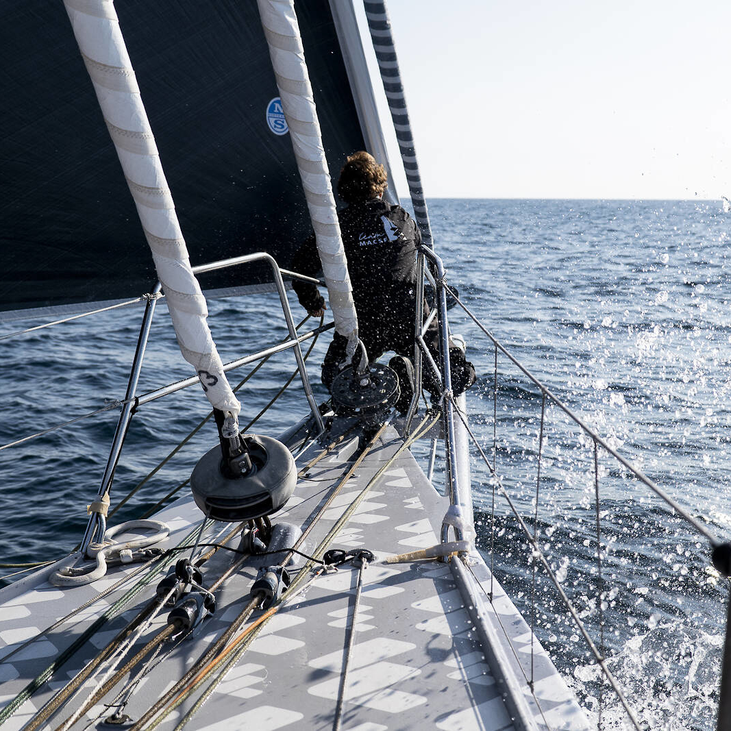 Isabelle Joschke à l'avant de l'IMOCA MACSF lors du Défi Azimut 2022, dernière course de préparation à la Route du Rhum