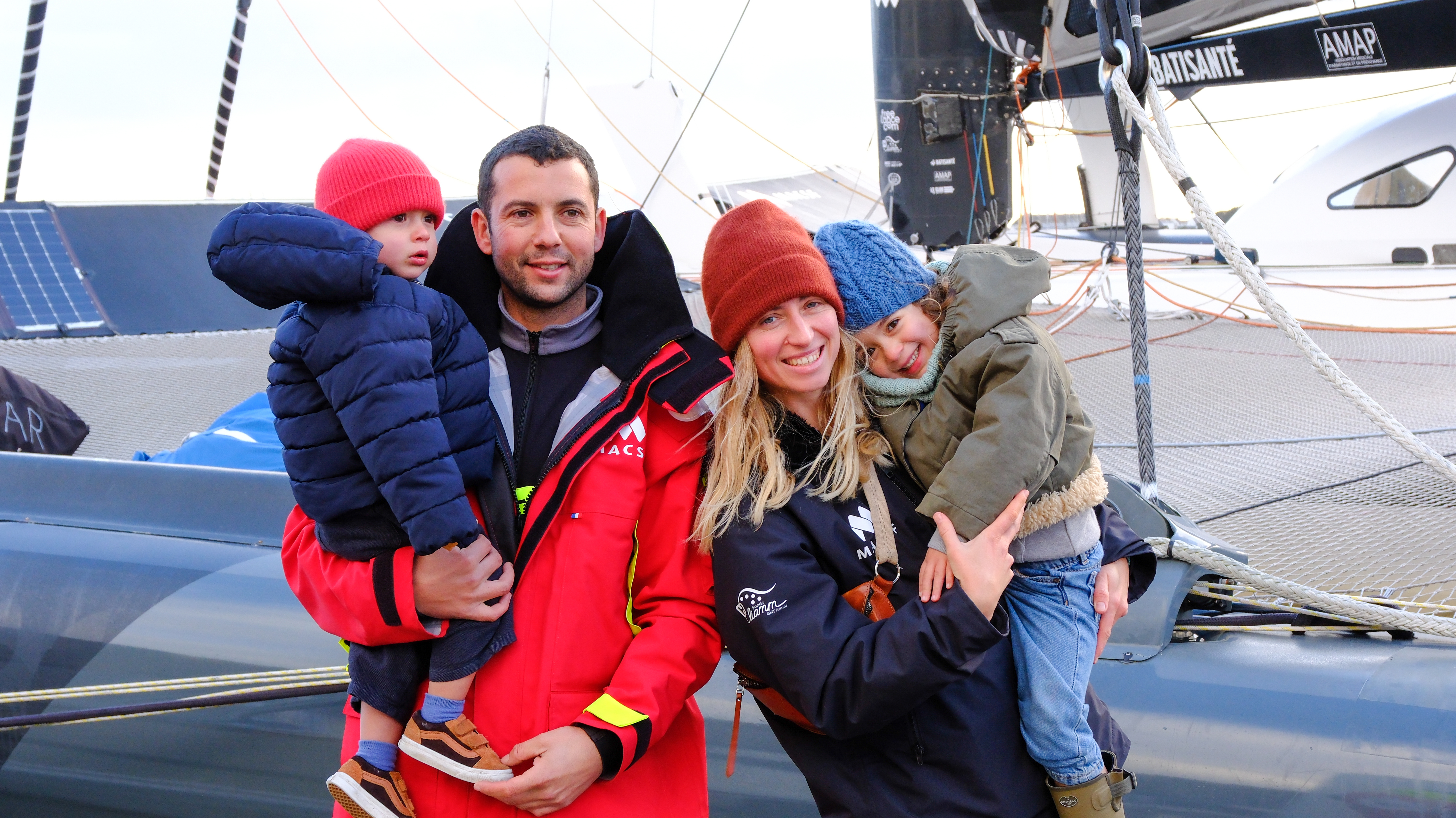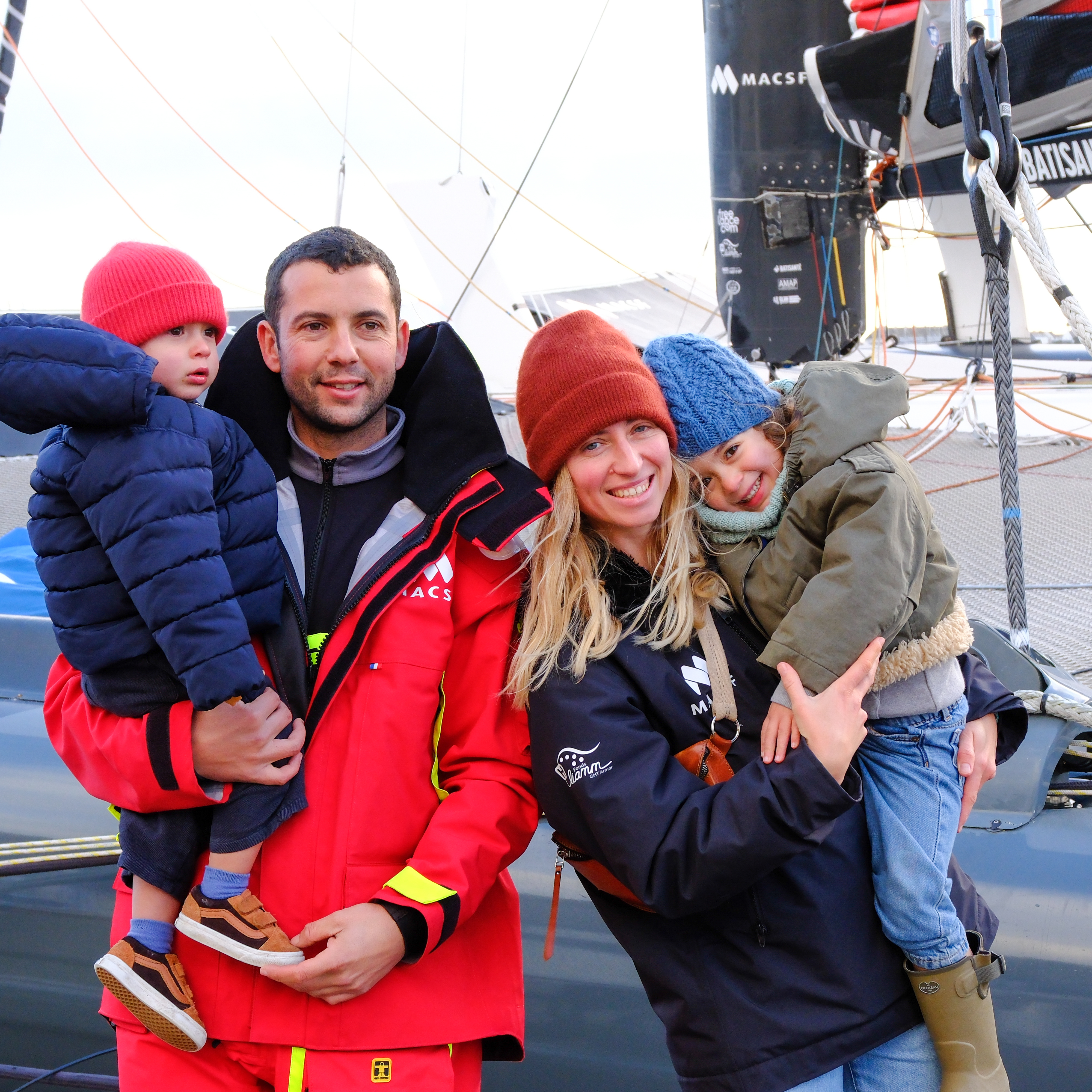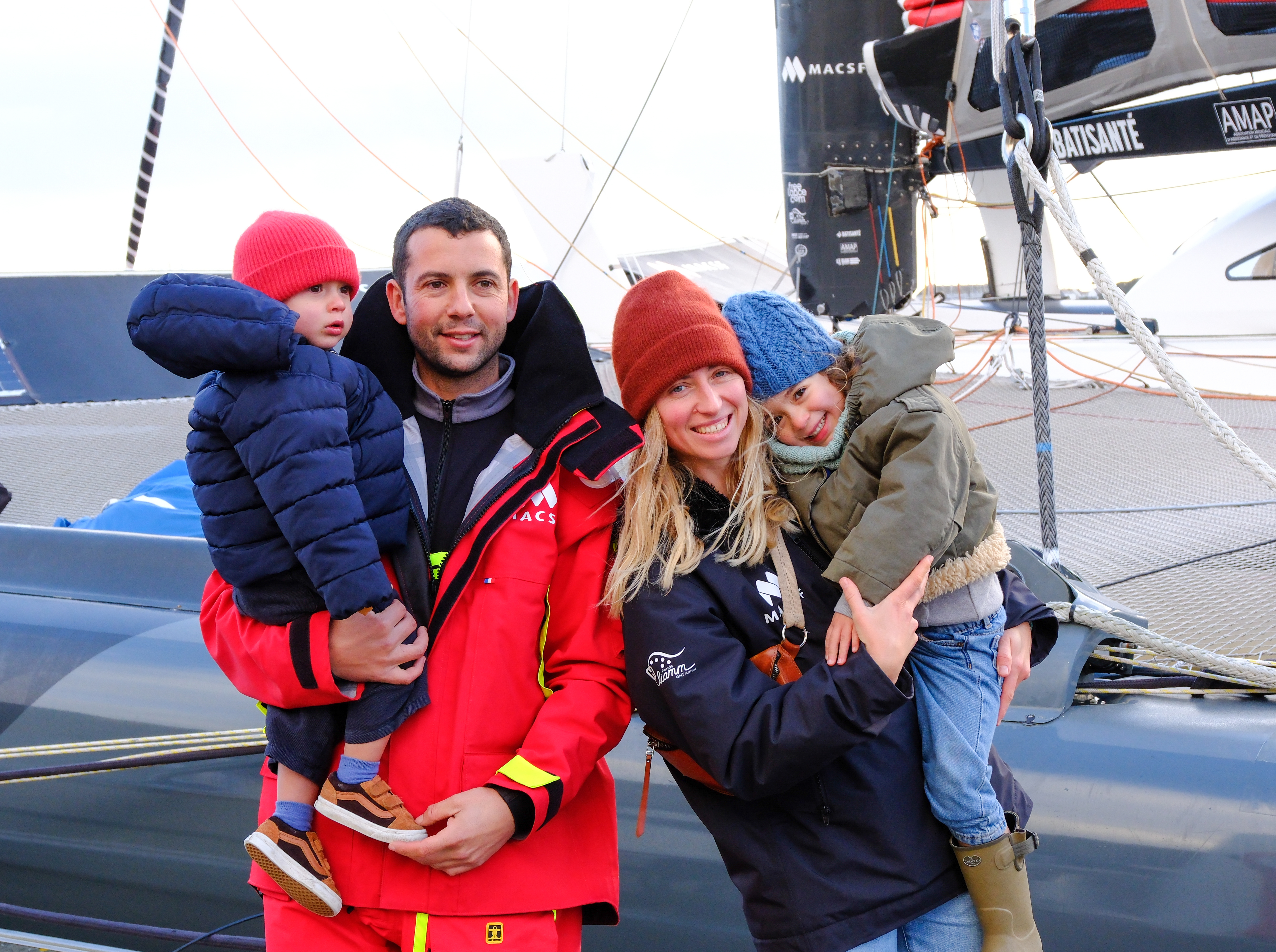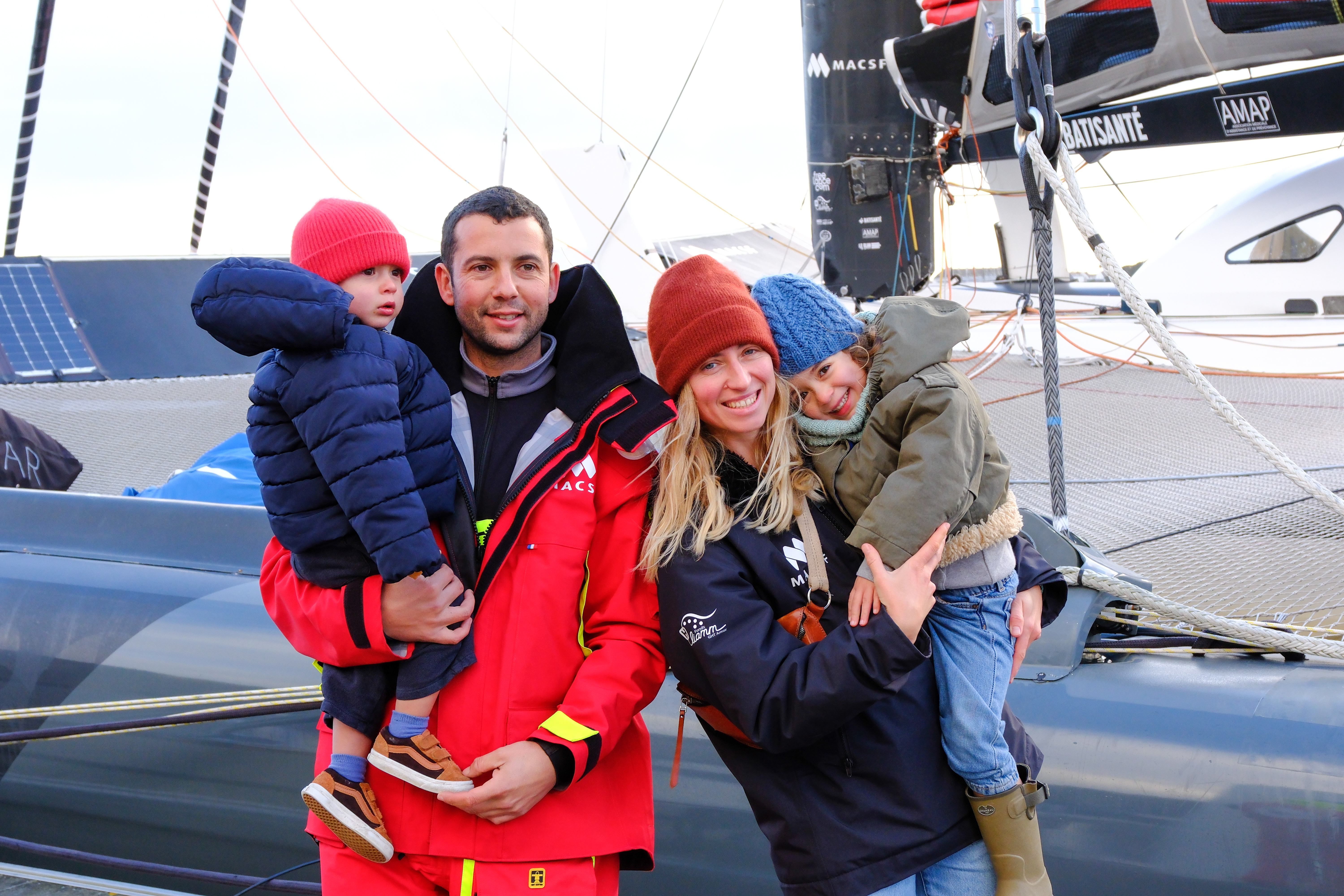 Dernière photo en famille de Guirec Soudée le 22 décembre 225, avant de monter sur son Ultim MACSF pour quitter le port de Lorient et rejoindre le Nord de l'île d'Ouessant, pour se lancer dans sa tentative de record du tour du monde à l'envers, en solitaire et sans escale.