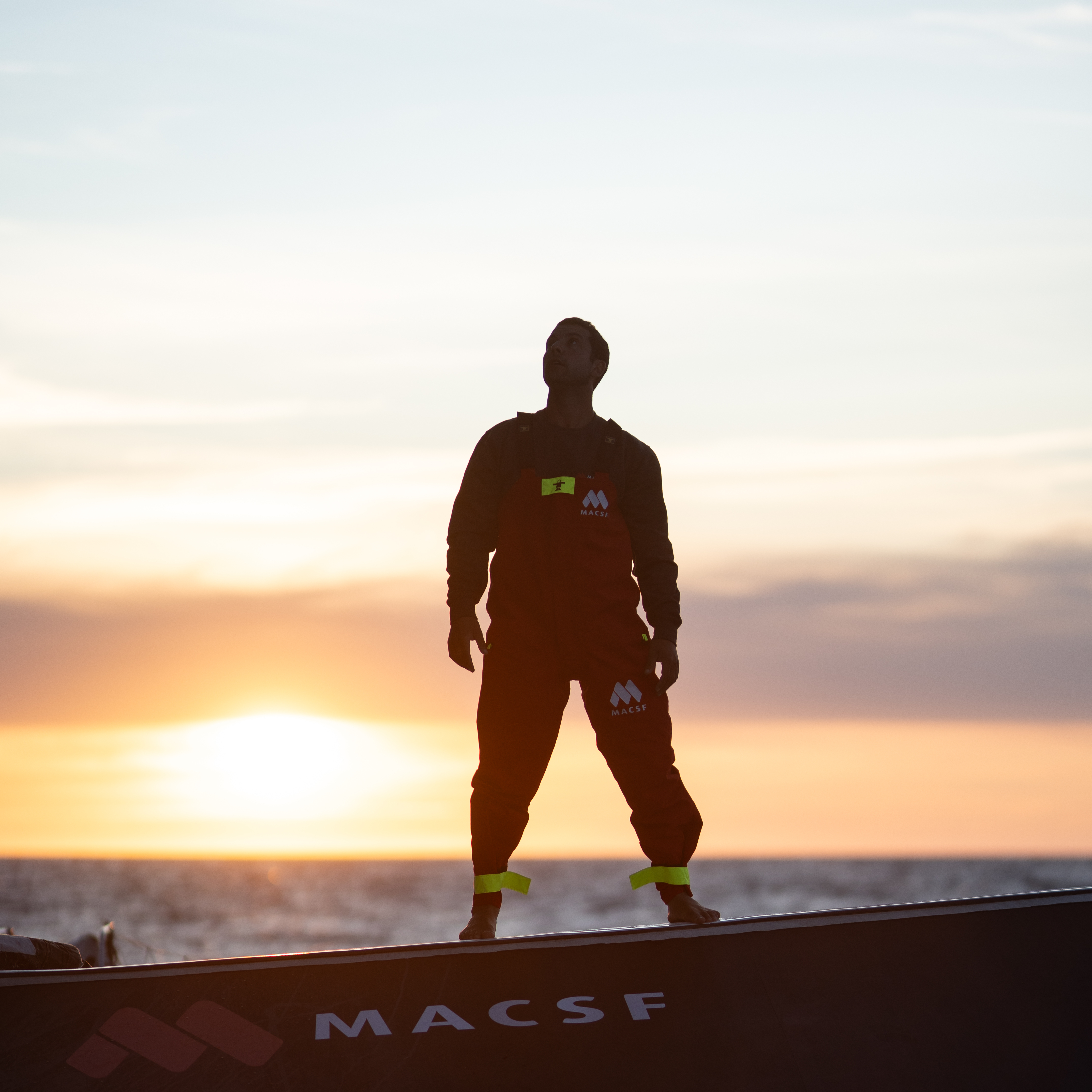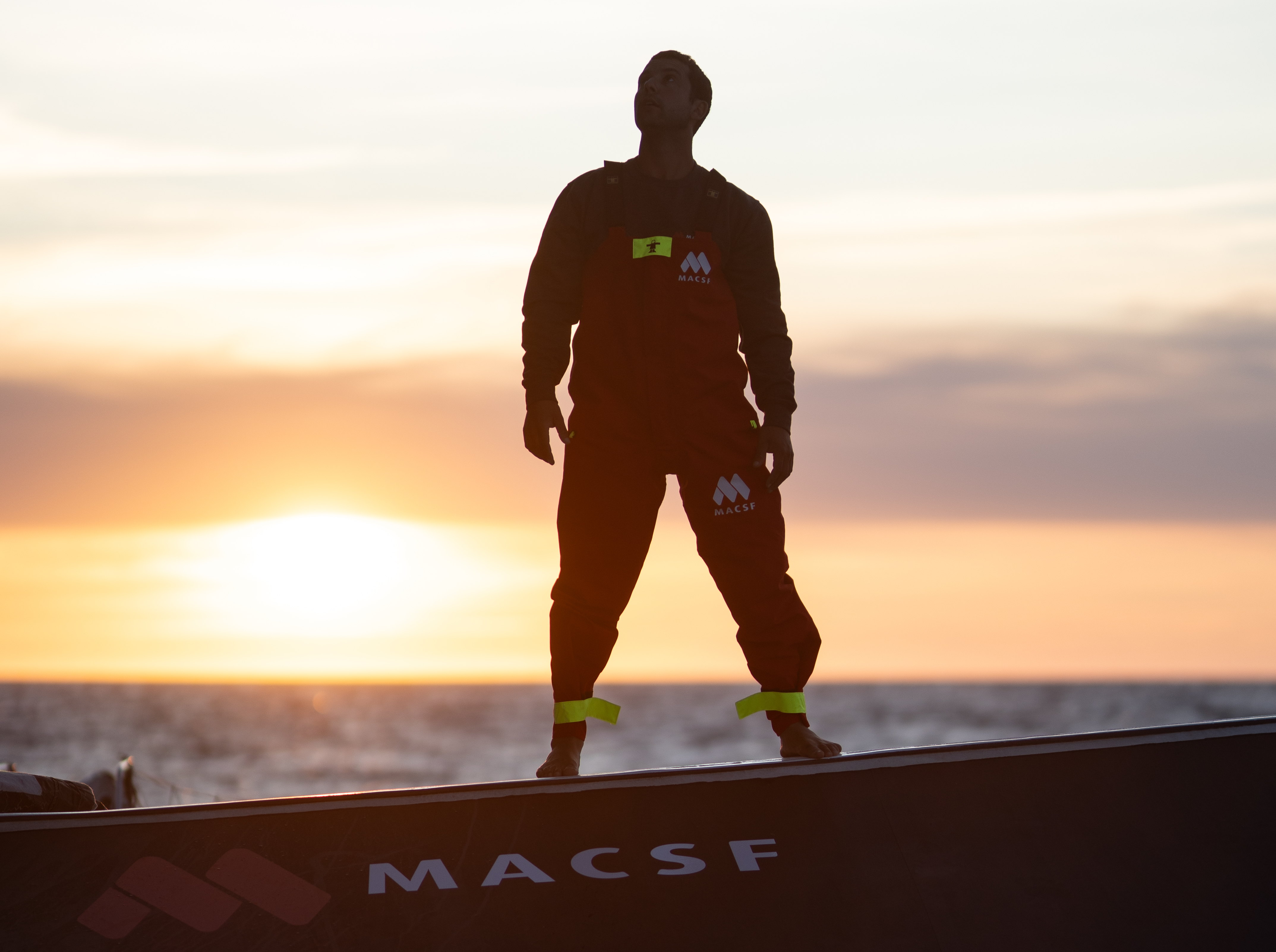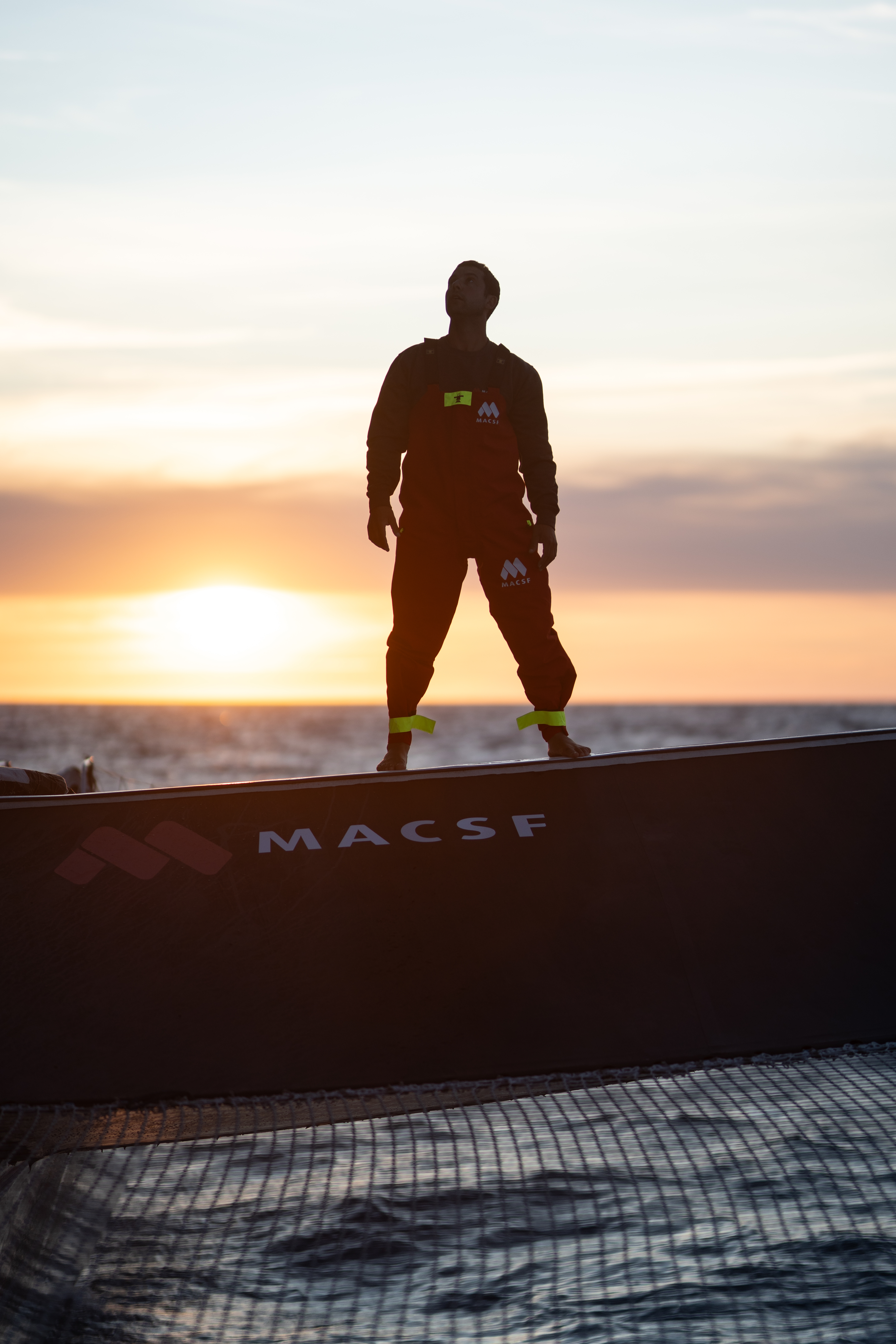 Le navigateur et aventurier Guirec Soudée au coucher de soleil sur l'Ultim MACSF. Il se prépare à battre le record du tour du monde à l'envers en solitaire sur ce trimaran gant de 31 mètres de long et 20 mètres de large.