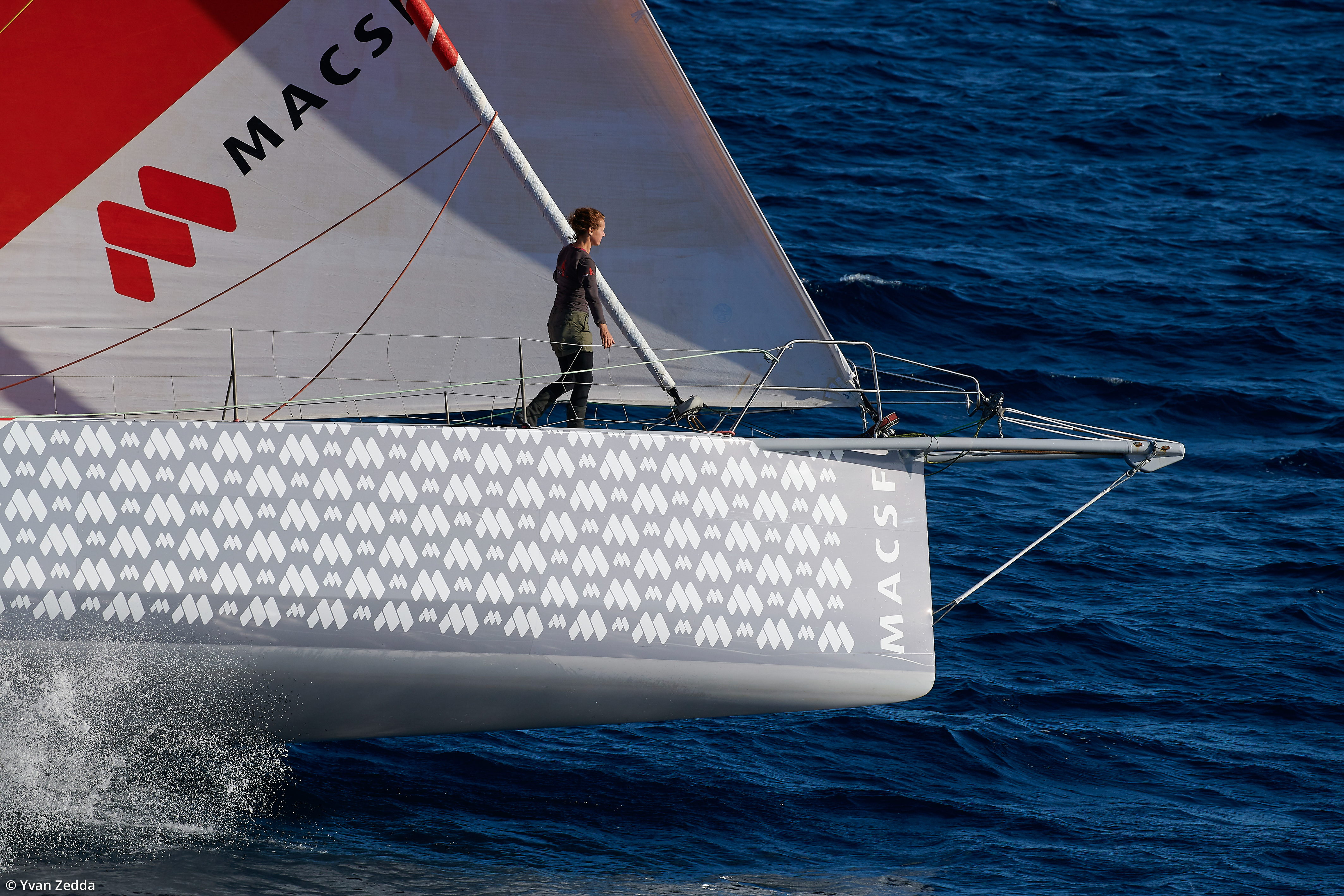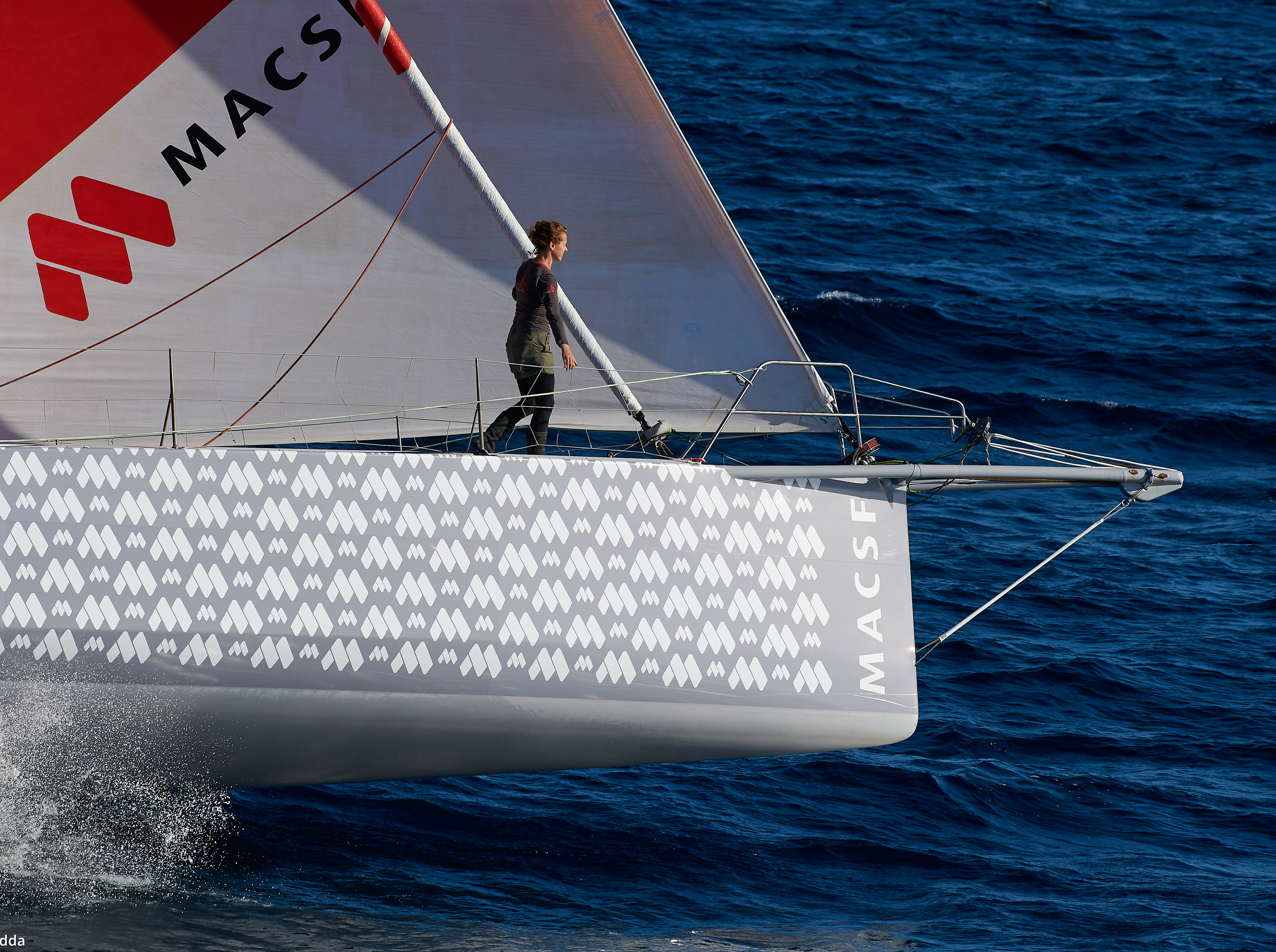 Isabelle Joschke sur le pont de l'IMOCA MACSF un mois avant le départ du Vendée Globe 2020. C'est la première fois que la navigatrice participera à cette course autour du monde en solitaire sans escale et sans assistance.