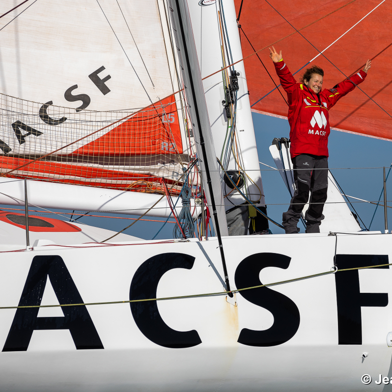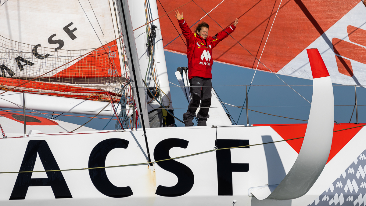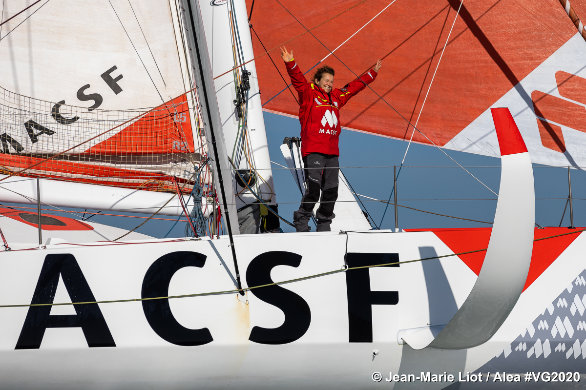 Isabelle Joschke sur l'Imoca MACSF arrive aux Sables d'Olonne le 24 février 2021. Elle a réussi à boucler son tour du monde en solitaire. Elle termine cette formidable aventure sportive hors course du Vendée Globe en raison d'une avarie de quille qu'elle a pu faire réparer au Brésil, mais heureuse de ce qu'elle a accompli.