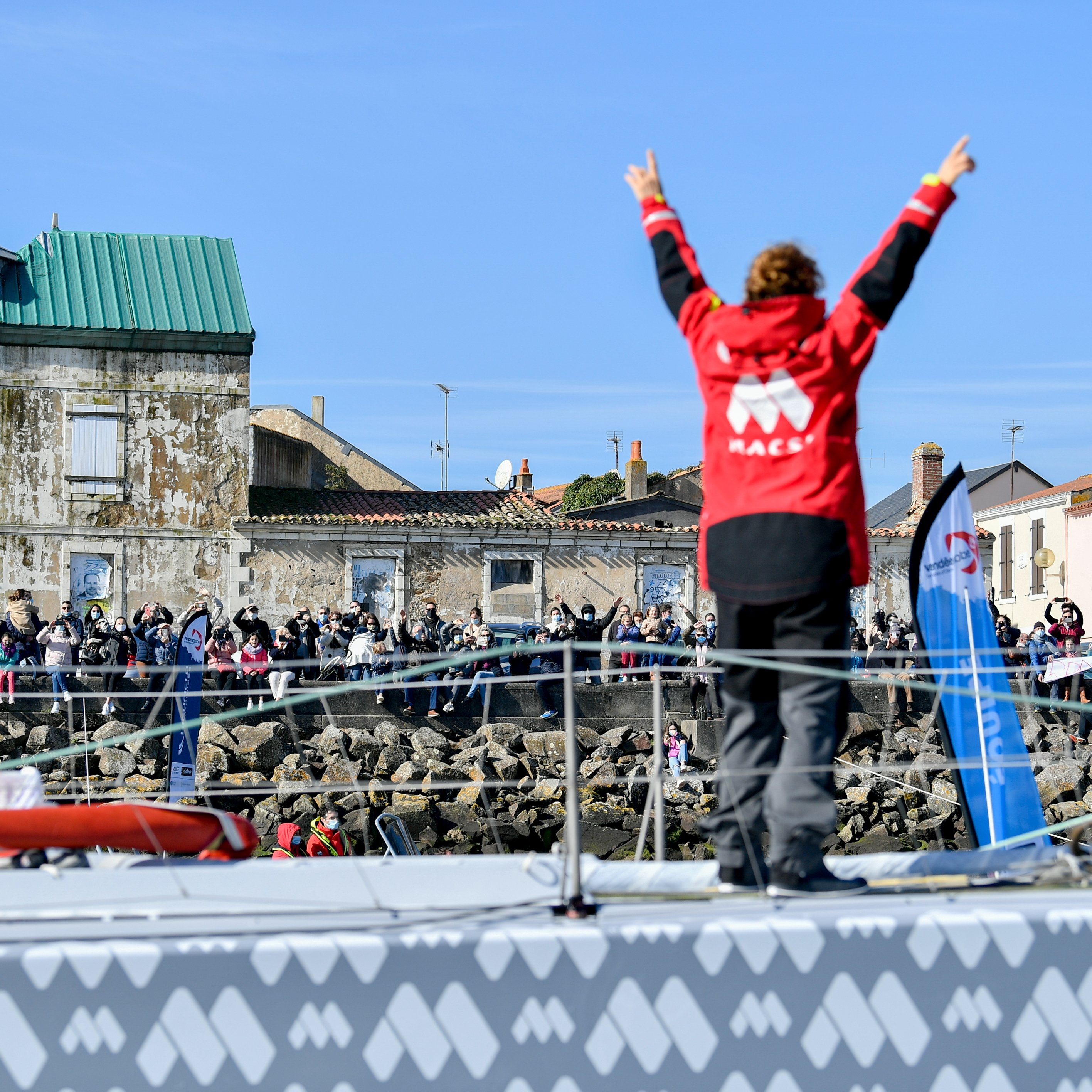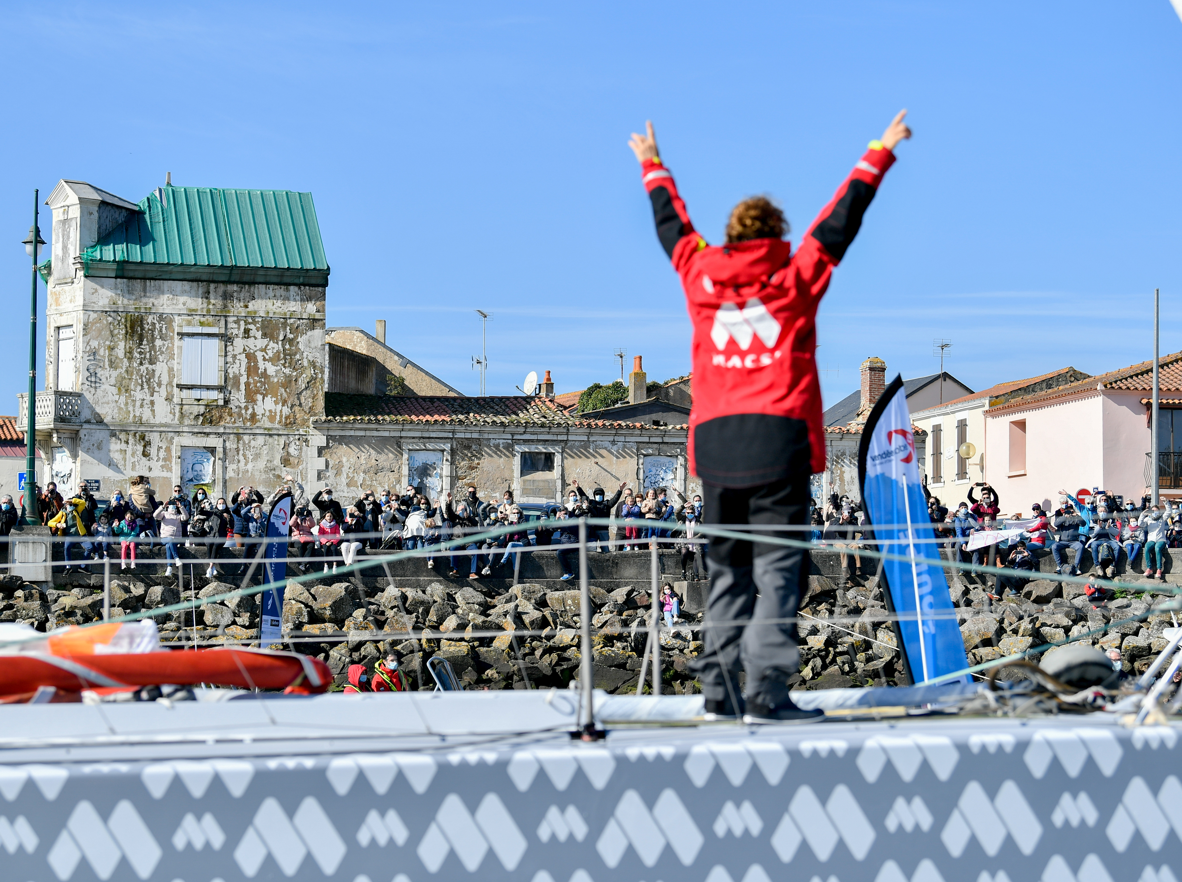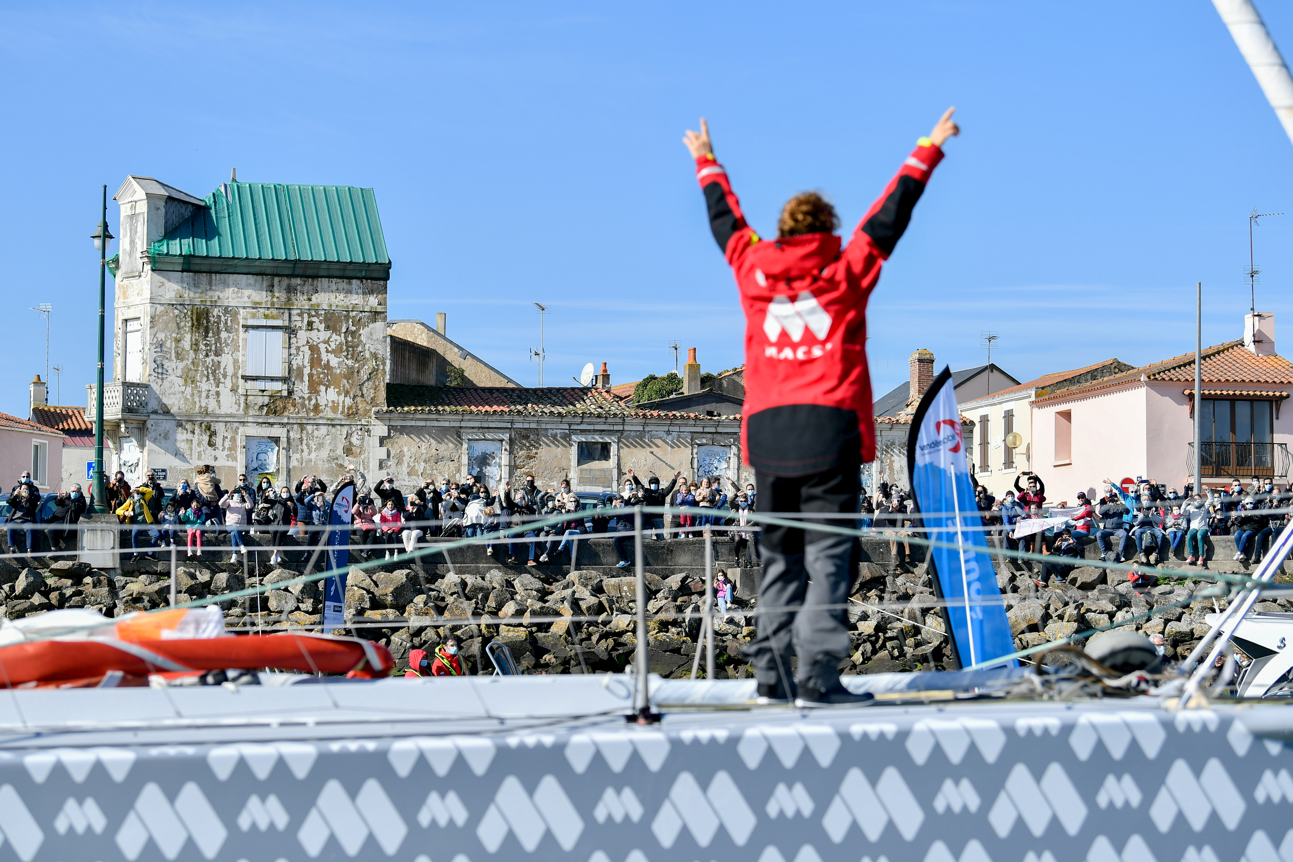 Une foule applaudit Isabelle Joschke à son arrivée aux Sables d'Olonne le 24 février 2021. Même si la navigatrice de l'IMOCA MACSF a terminé hors course du Vendée Globe, elle a réussi l'exploit de boucler un tour du monde en solitaire.
