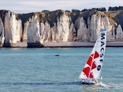 Le bateau aux couleurs de la MACSF est l'un des 29 IMOCA engagés dans la course de la Transat Jacques Vabre. La première étape après le départ donné au Havre est de passer la bouée Région Normandie face à Etretat.