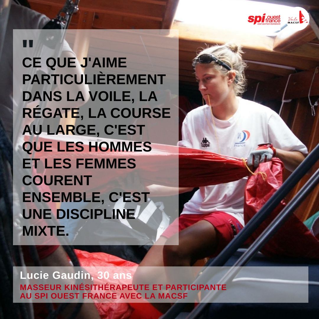 « Ce que j'aime particulièrement dans la voile, la régate et la course au large, c'est que les hommes et les femmes courent ensemble, c'est une discipline mixte », indique Lucie Gaudin.