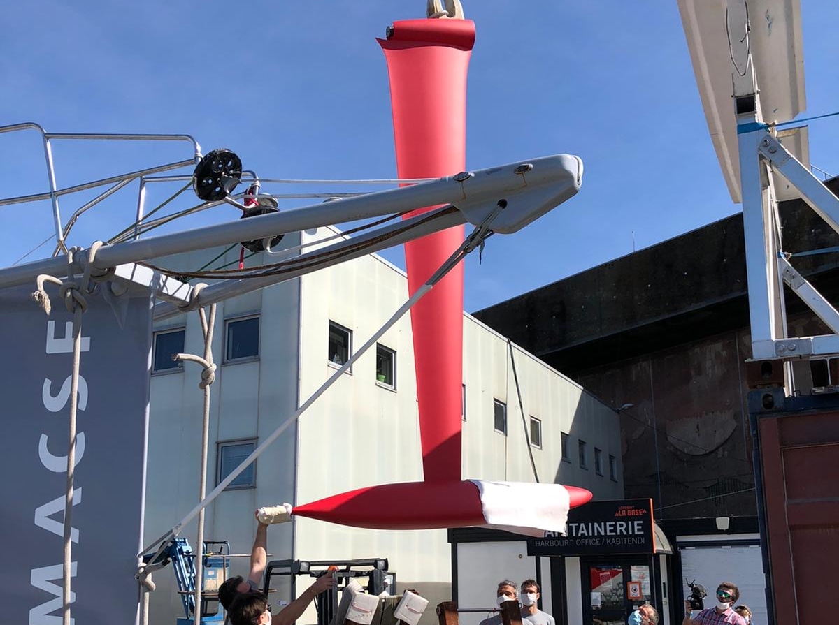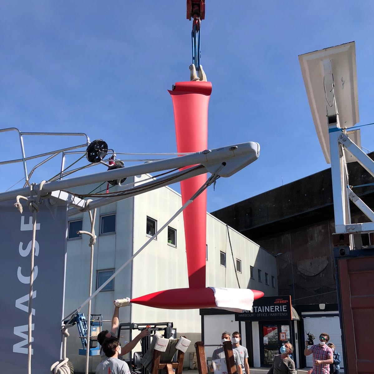 La fixation de la quille sur l'IMOCA MACSF est une opération délicate avant sa remise à l'eau le 21 mai 2020.