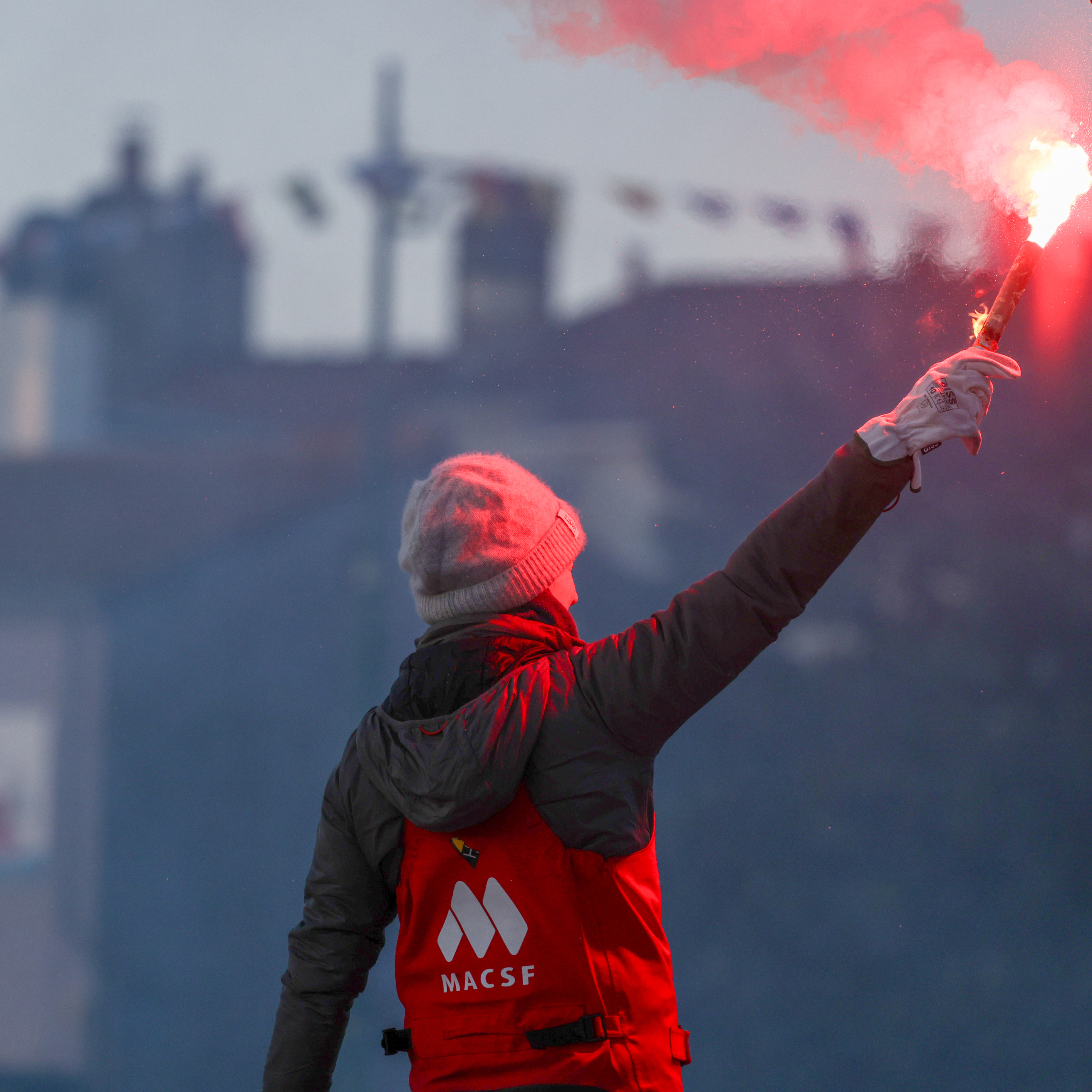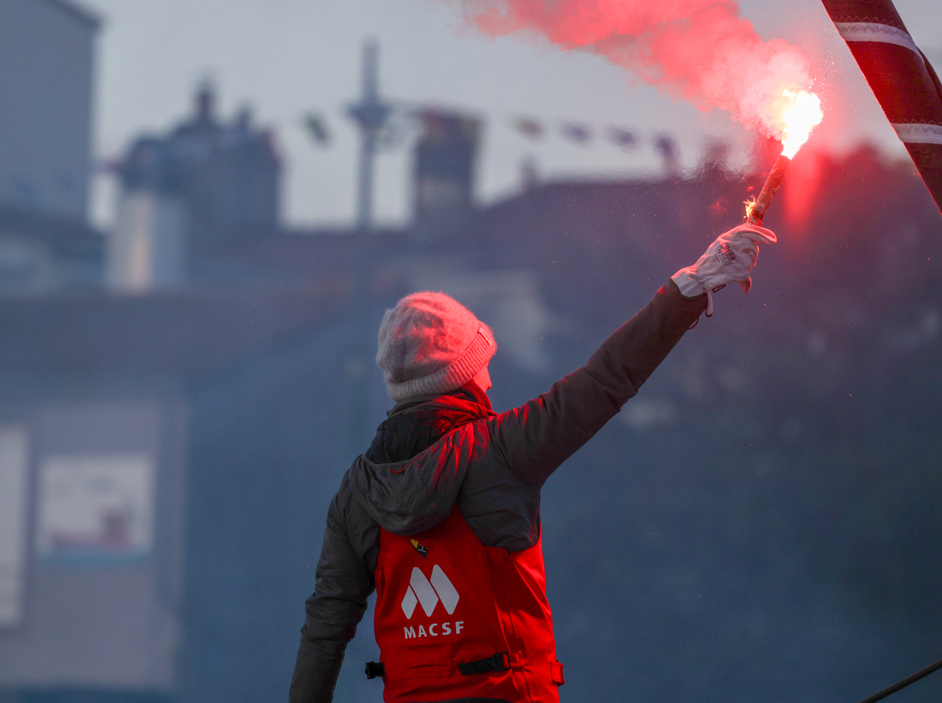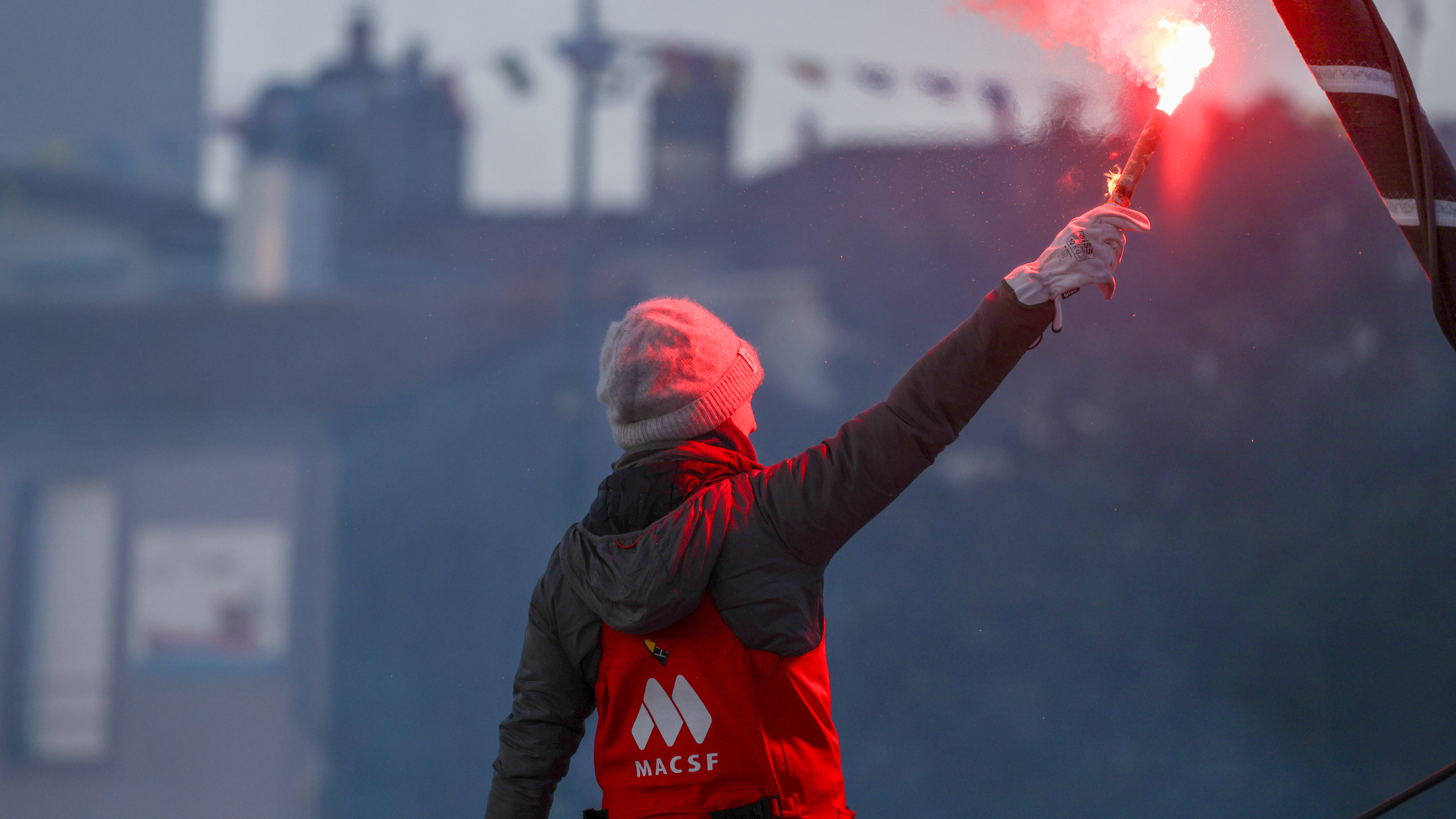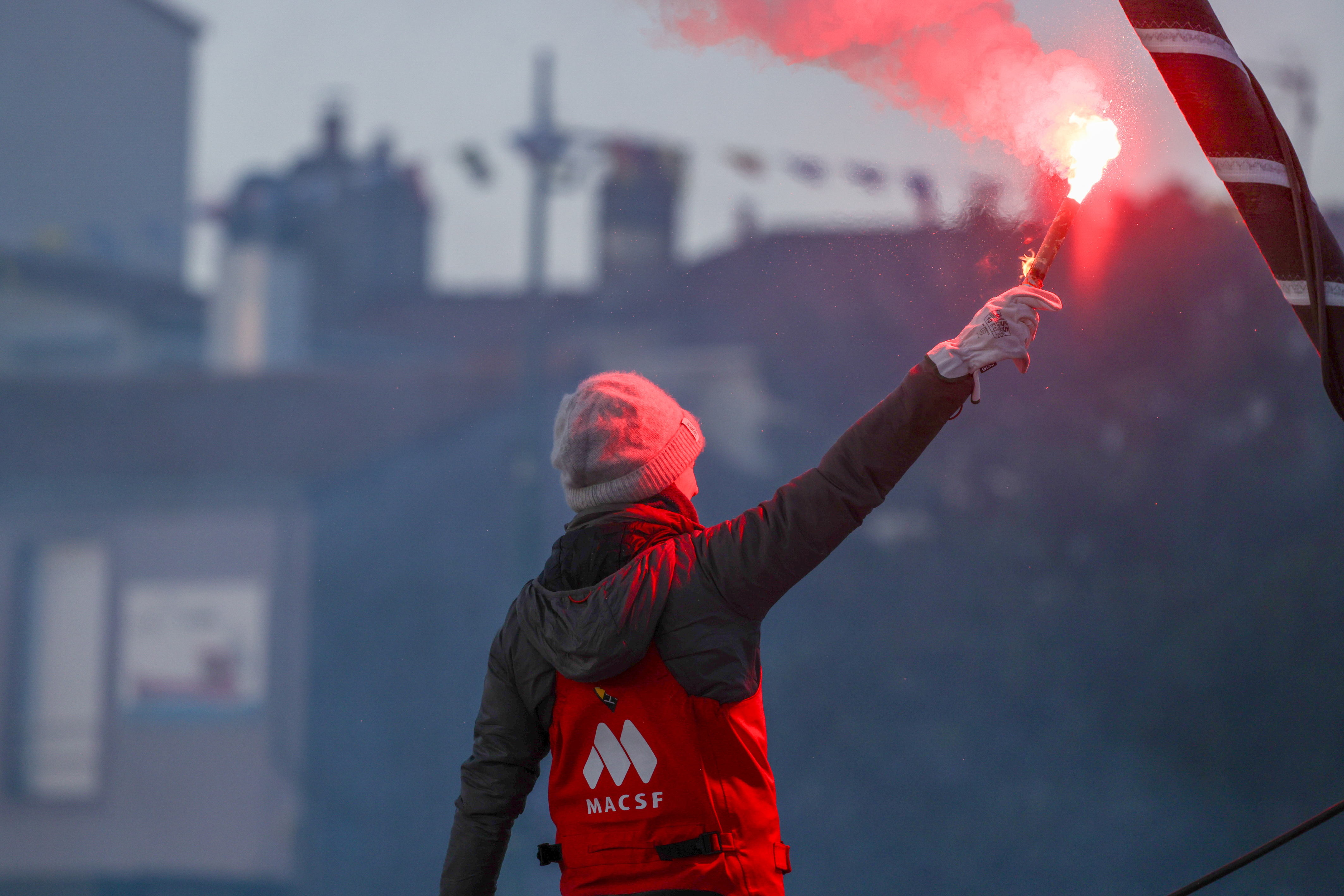 Isabelle Joschke a fait son entrée dans le chenal des Sables d'Olonne à bord de son IMOCA MACSF, après avoir passé la ligne d'arrivée du Vendée Globe le 4 février 2025 au terme de 85 jours de course.